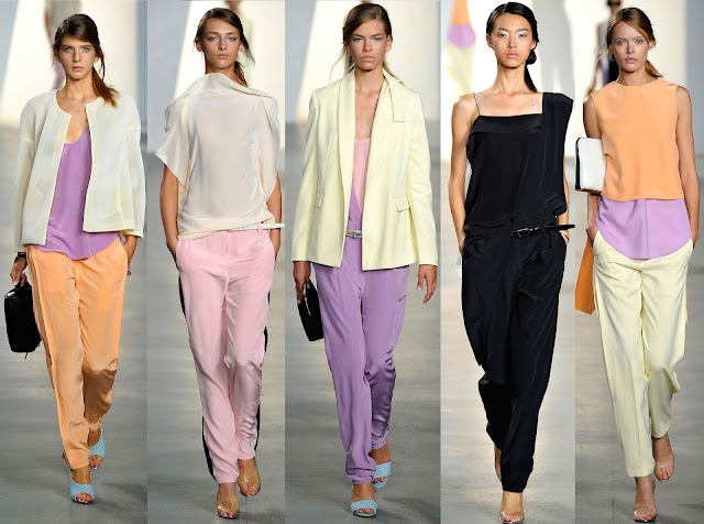 Phillip Lim's Spring 2012 collection was sports theme with relaxed vs. structured shapes and sporty layers for his 3.1 Philip Lim collection; the palette of soft pastels like limoncello, lilac, and shell pink; offset with black, white, ivory, and khaki. Flowing clothes, made from silk, include side-slit trousers to delicate dresses with geometric ruffles and striping details. There were sporty pieces include outwear jacket, racer tops and masculine, boxy tailoring.