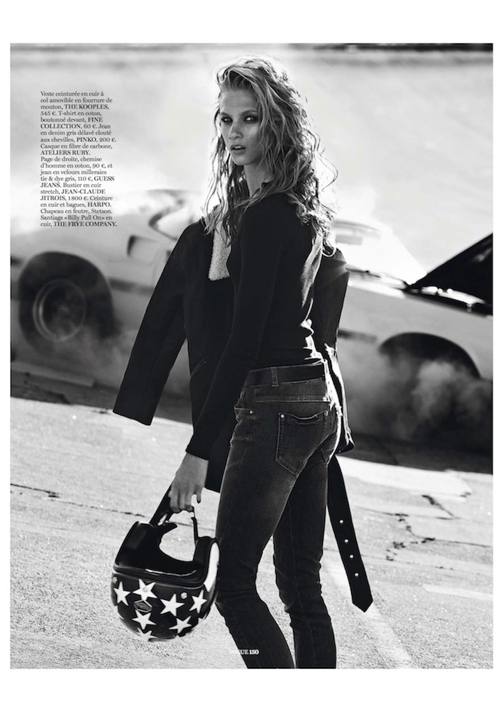 Lachlan Bailey shoots the Russian beauty in the part black and white set featuring classic sports car on a race track. Anna Selezneva goes on the road dressed in sexy denim and biker leathers for Vogue Paris, styled by Geraldine Saglio using labels such as The Kooples, Pink & Ralph Lauren.
