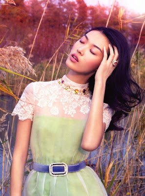 One of the top trends for the Resort collections is all about pastel colours, Stockton Johnson photographs them for Vogue China. Beauty Tian Yi wears delicate, feminine pieces of lace and chiffon in a colourful field wearing designs from the likes of Salvatorre Ferragammo, John Galliano, Dior and Valentino styled by Yi Guo.
