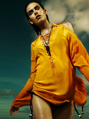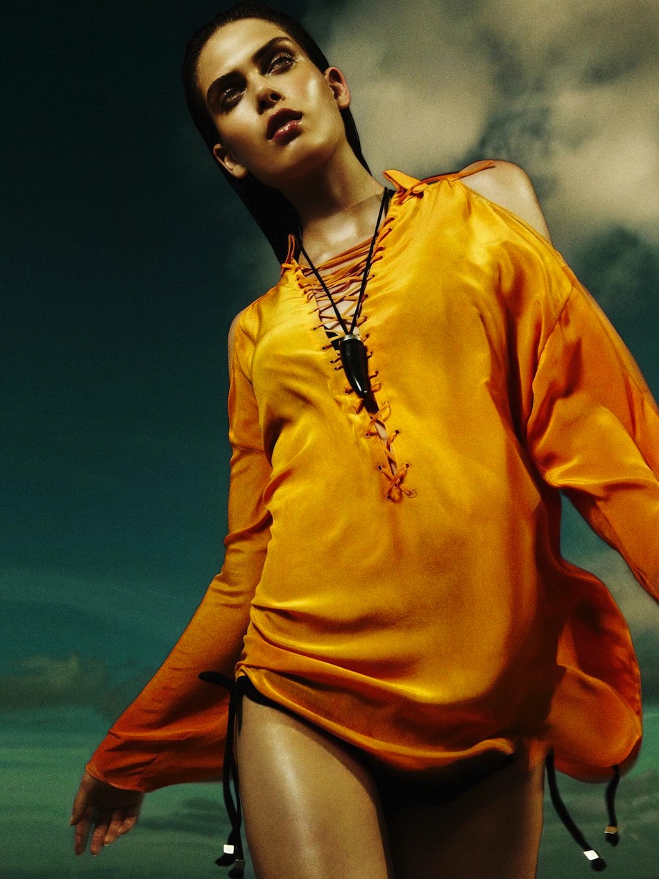 Strand Chic - As the sun sets photographer Katerina Tsatsanis shoots as swimwear ready looks for the evening for the July issue of Elle Germany. Danish beauty Katerina Tsatsanis poses in silk flowing attire paired with gold jewellery, styled together by Astrid Doil. Hair & Makeup by Manos Vynichakis.