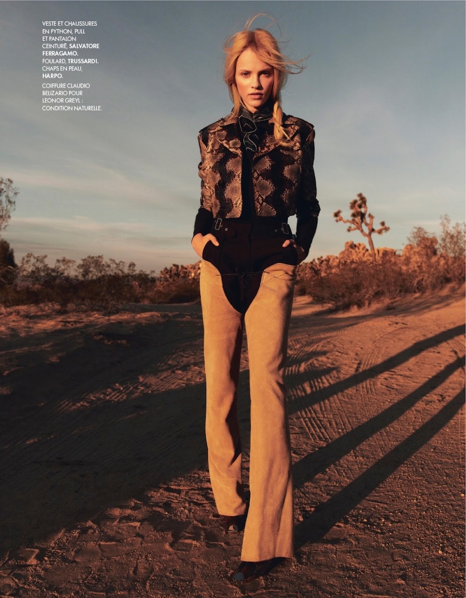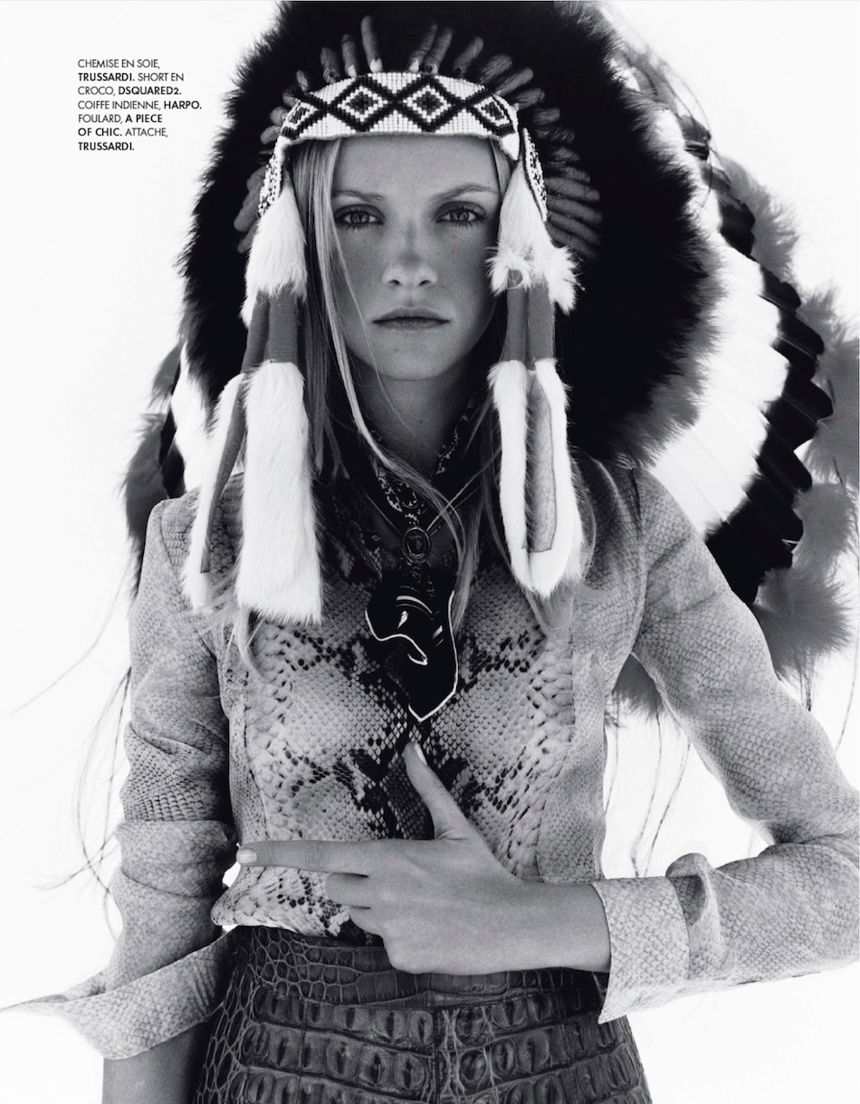 The New Western - Blonde beauty Ginta Lapina hits the desert countryside in western/native-american/cowboy inspired looks as Elissa Castelbou styles the eclectic looks withe likes of Moschino, Salvatore Ferragamo, Giorgio Armani & Emilio Pucci, the scenic imagery is shot by Jan Welters for the cover-story of Elle France. Hair by Claudio Belizario, Makeup by Tiina Roivainen.